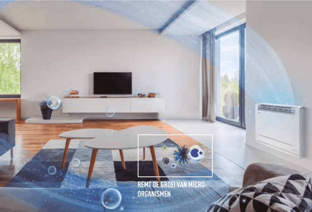 Een lucht/lucht warmtepomp (airconditioning) onttrekt warmte uit de buitenlucht door middel van de buitenunit (bij verwarmen) en pompt deze warmte door middel van het koudemiddel naar de binnenunit. Hier wordt de warmte afgegeven en door de ventilor verspreid in de ruimte.